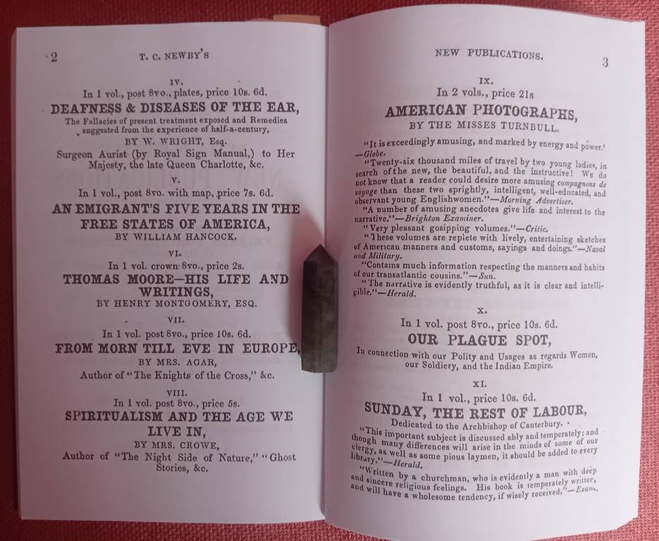 When I was at the plotting stage of my story, I wanted a real family for my fictional Priddies to interact with. I ‘auditioned’ several, including the engineering Hollands and the mine-owning Oakeleys. My interest sparked when I read about Charles Easton Spooner who, following the death of his wife, took in his spinster sister to look after his house and children. Further rummaging in the family history revealed that Louisa was a published novelist at a time when women weren’t meant to do that sort of thing, it being judged a shameful occupation in polite society. Currently there is one of Louisa’s novels in print, ‘Gladys of Harlech’ (1858), published by Honno, a re-telling of the Wars of the Roses from the Welsh perspective. There are also two contemporary novels, ‘Country Landlords’ (1860) and ‘The Welsh Heiress’ (1868). I found facsimile copies of both, the latter in three volumes of varying design, size and quality, which made for interesting and sometimes confusing reading. (There are also several pages of splendid Victorian adverts in the back of Vol. 1 – lump of labradorite in the photo as a page weight!)